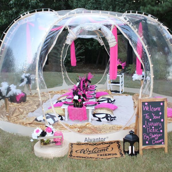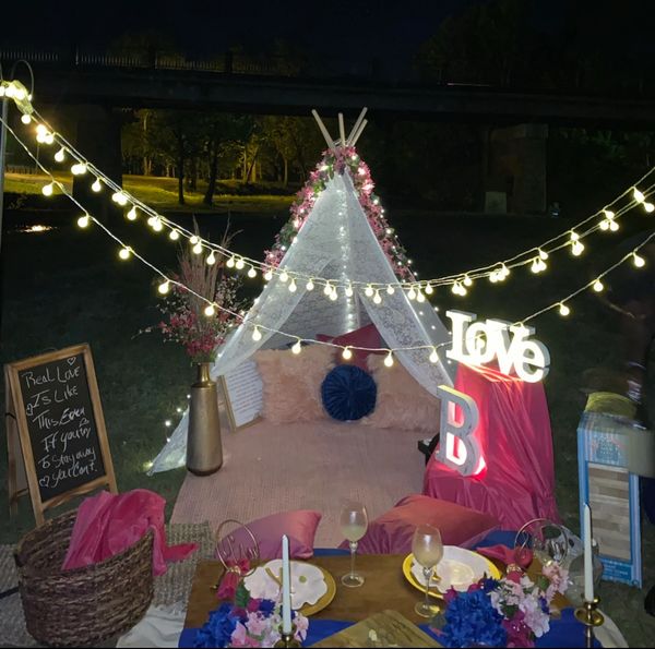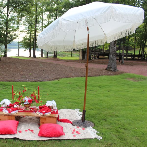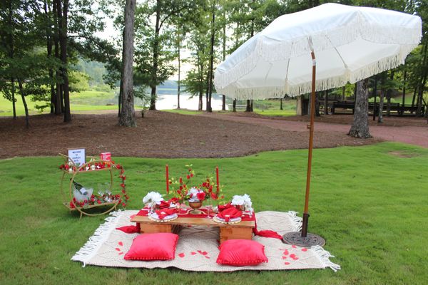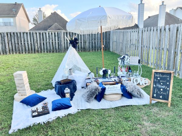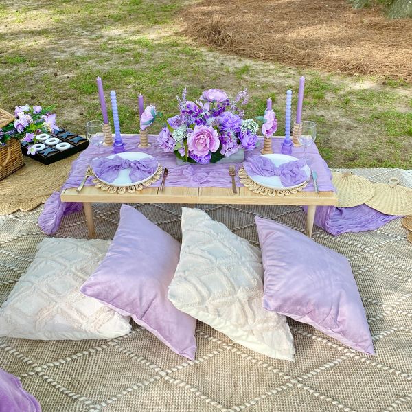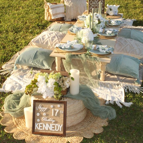 Set up and clean up, Picnic Table,Table Runner, Floral Arrangement, Utensils, Decorative Charger + Dinner Plates, Cloth Napkins, Decorative Pillows, Wine Glass, Rug, Candles + Light(Evening picnics only), and Chalkboard sign with a personalized message