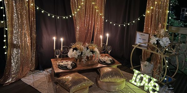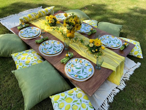 Set up and clean up, Picnic Table,Table Runner, Floral Arrangement, Utensils, Plates, Decorative Pillows, Glassware, Rug, and Chalkboard sign or Letter board with a personalized message